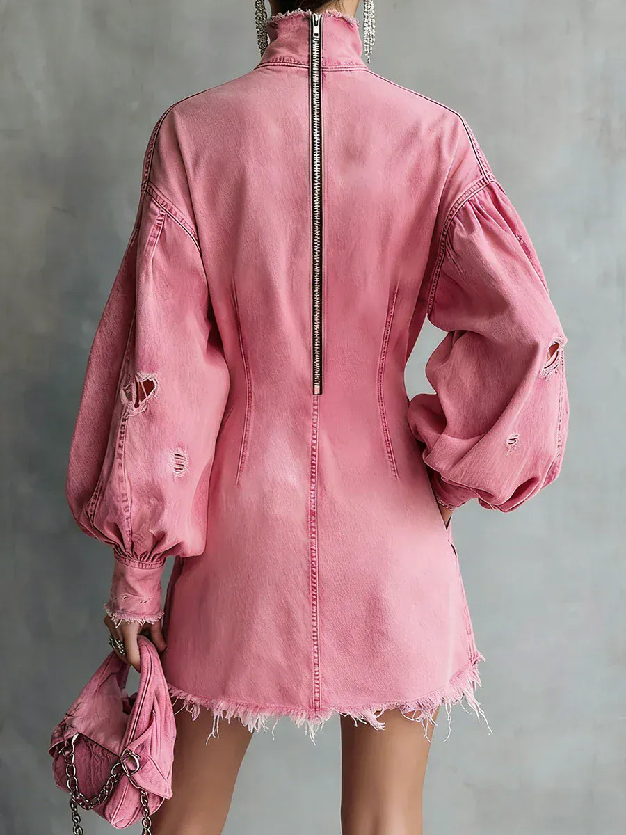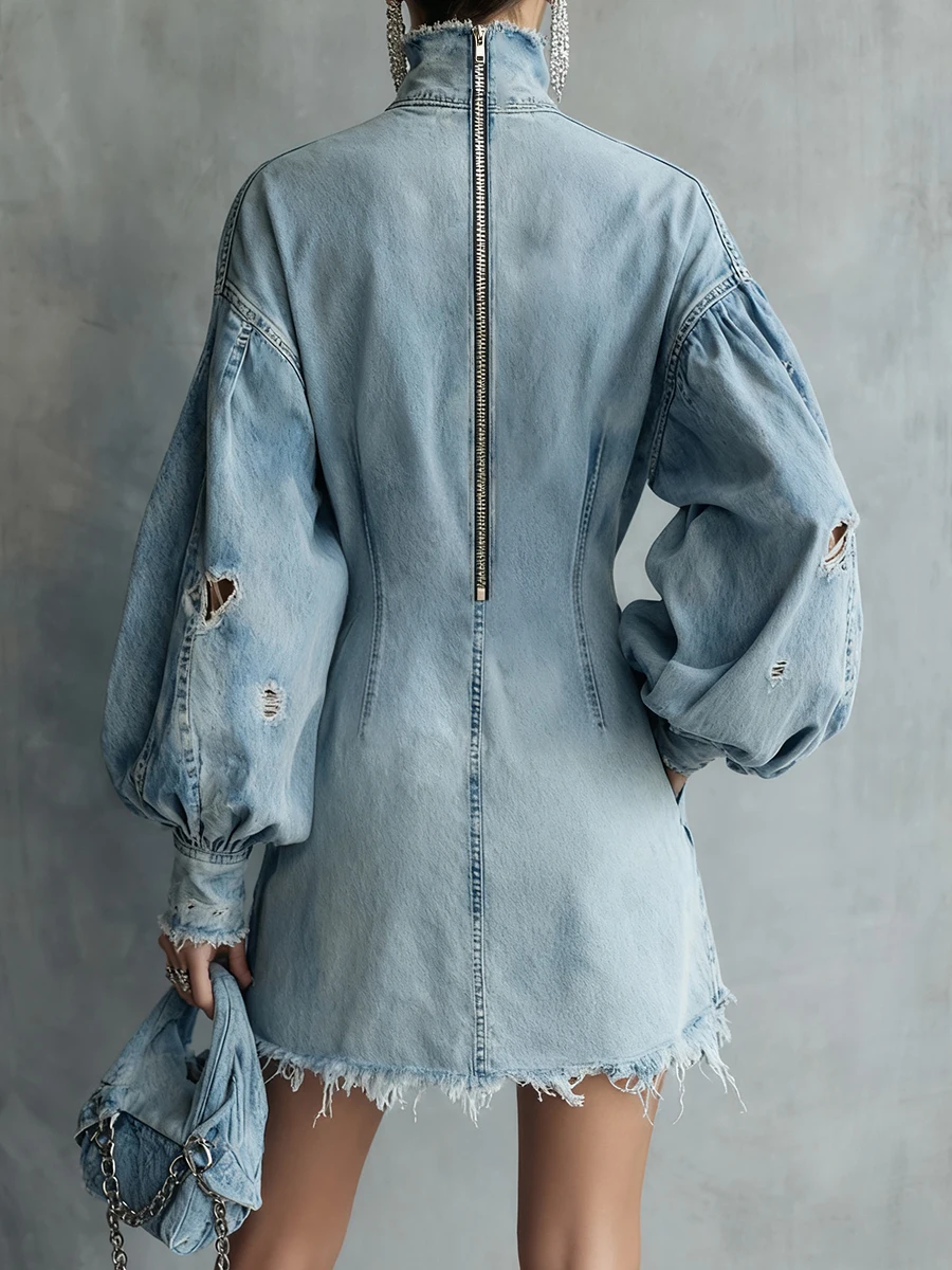 Women's Vintage Denim Mini Dress with Lantern Sleeves & Turtleneck