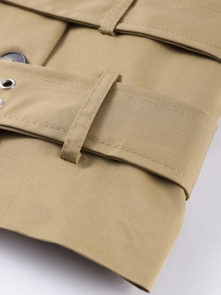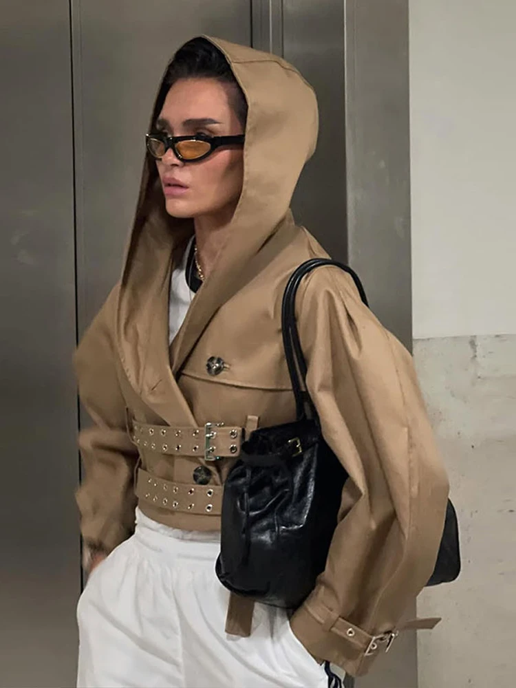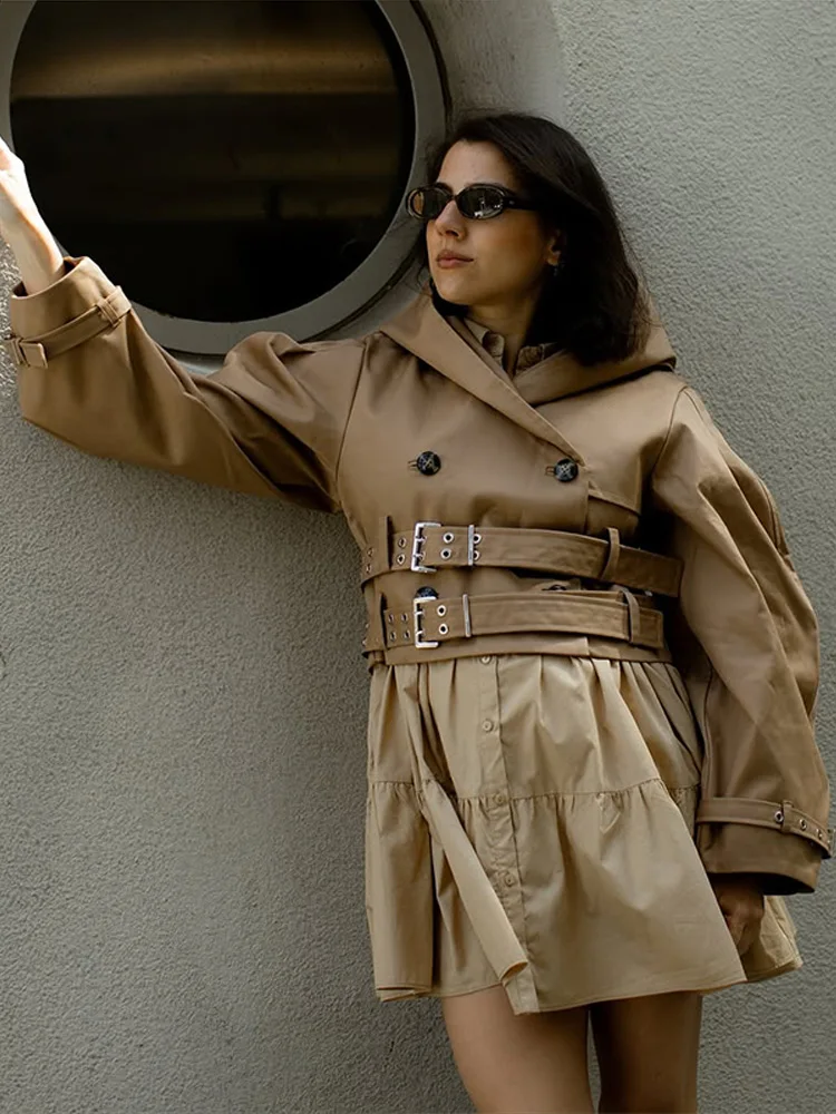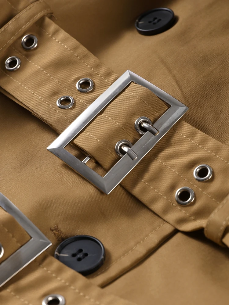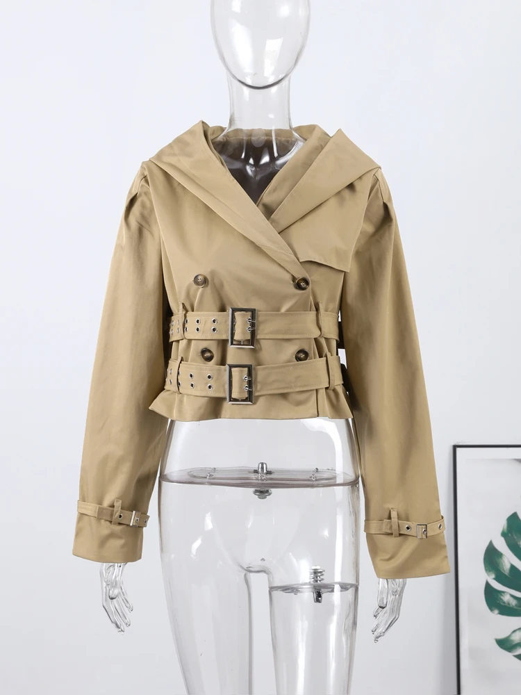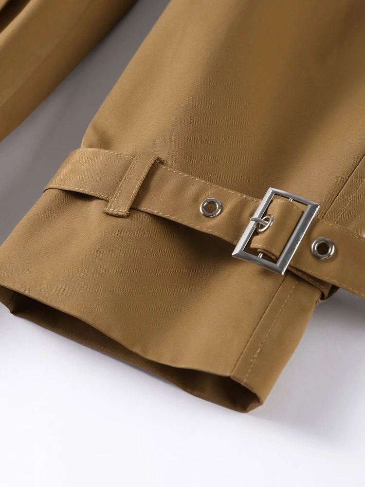 This beige cropped trench jacket features a double-breasted design and a wide lapel, combining classic trench elements with a modern, trendy silhouette. It’s perfect for adding a chic touch to your outfits. 🧥