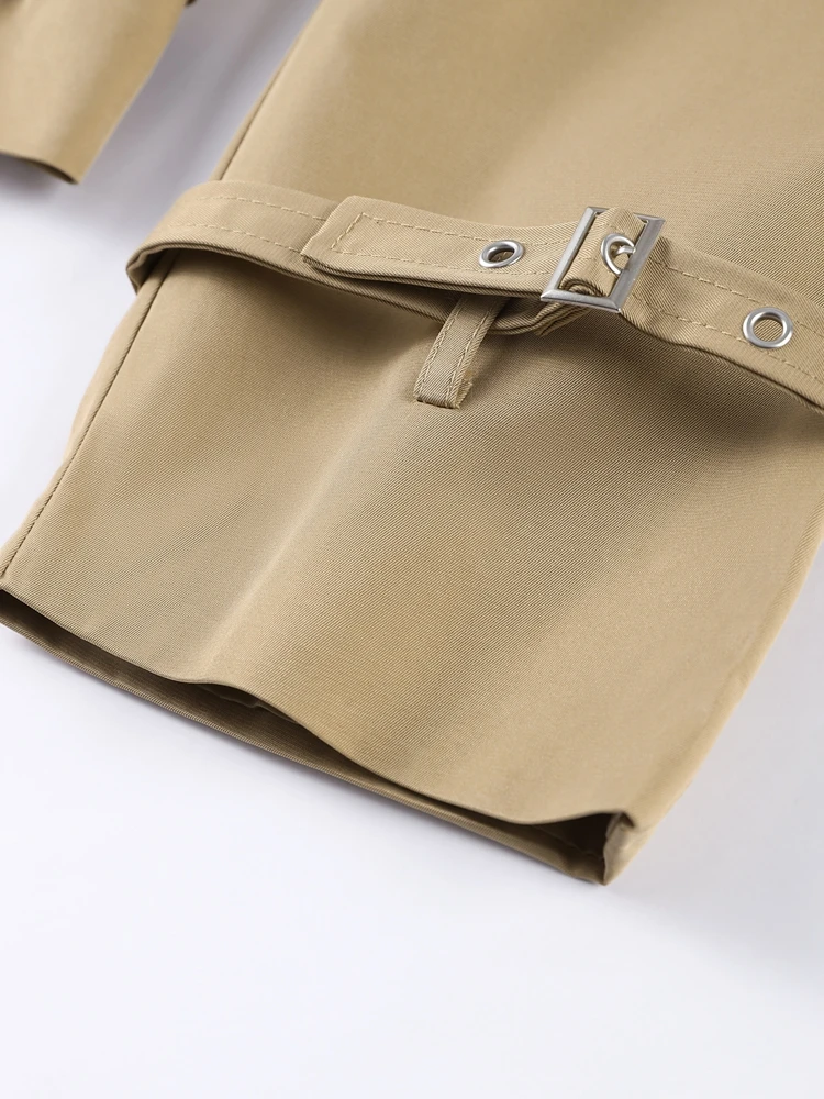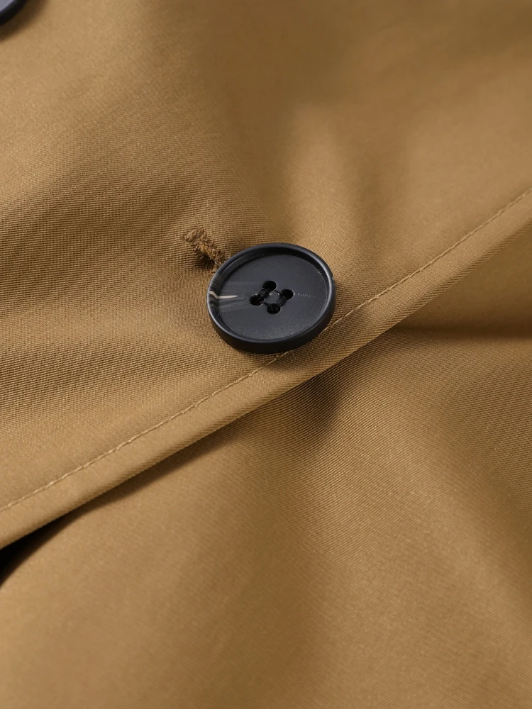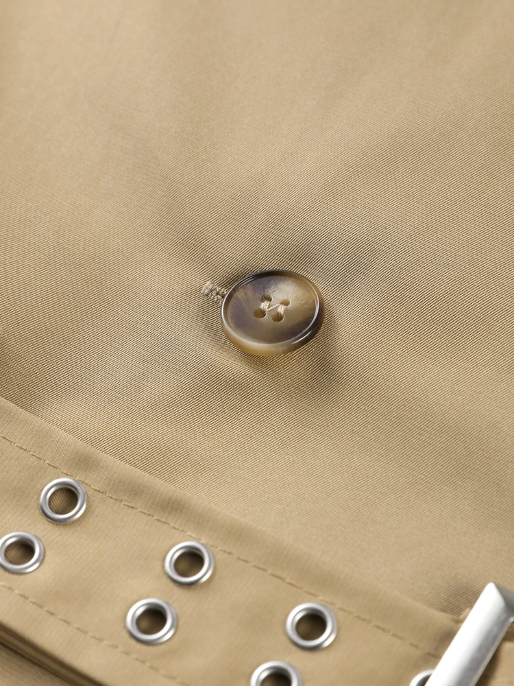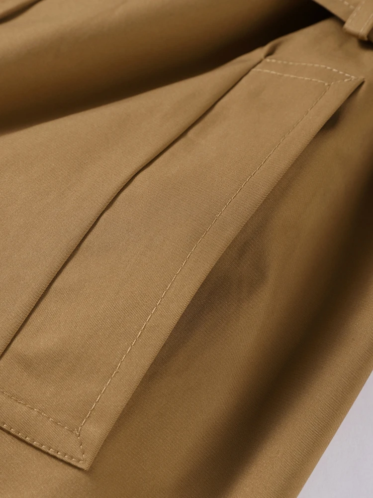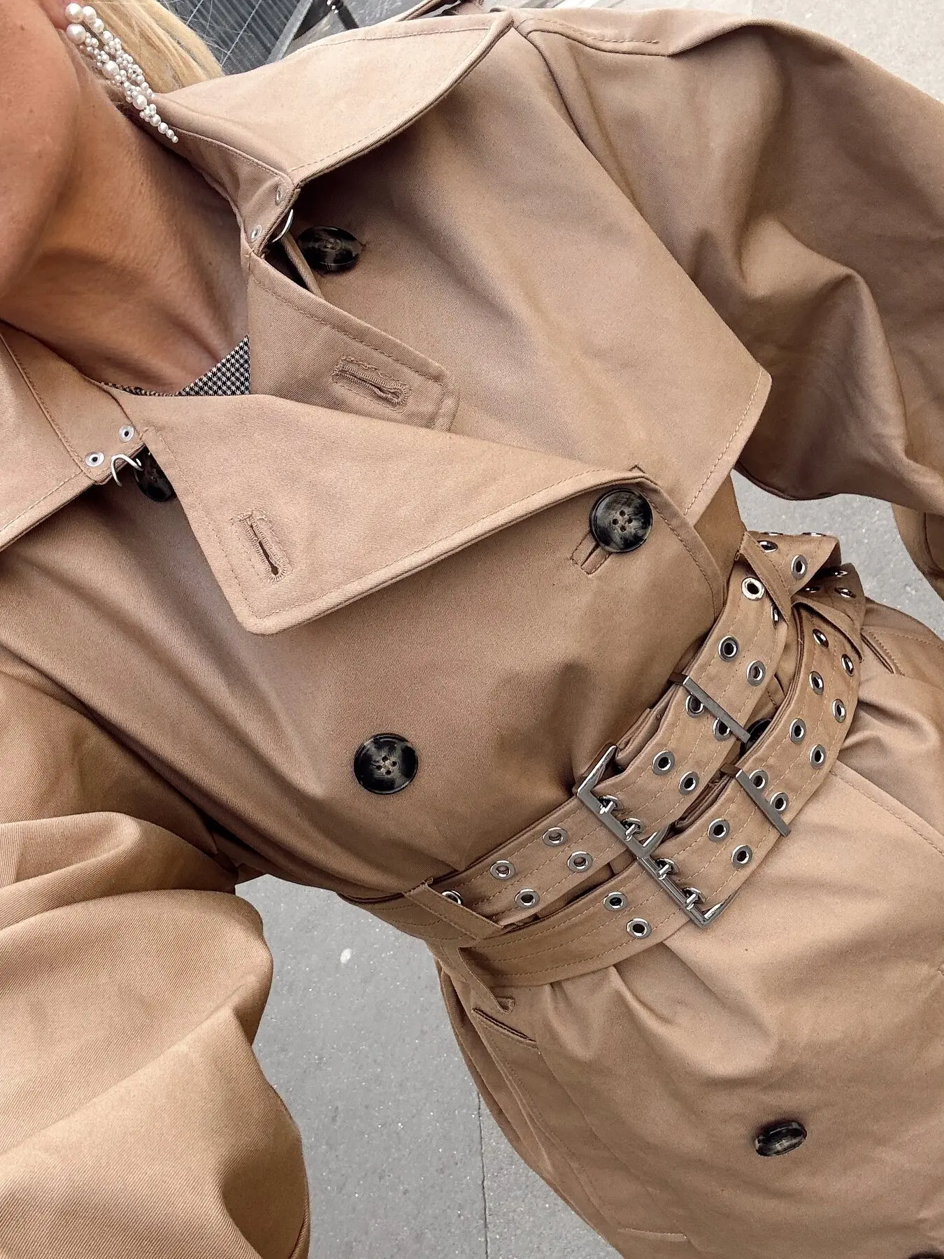 This beige cropped trench jacket features a double-breasted design and a wide lapel, combining classic trench elements with a modern, trendy silhouette. It’s perfect for adding a chic touch to your outfits. 🧥