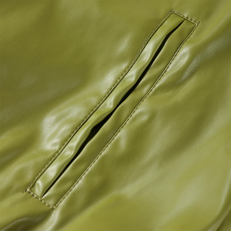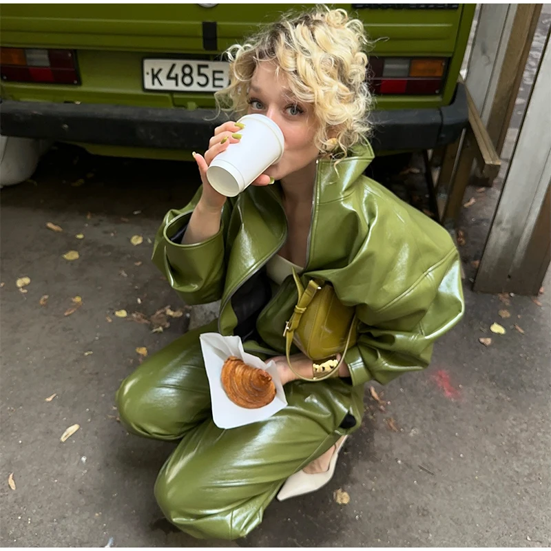 Model Number: Vintage Green Leather Jacket Skirt Set Women