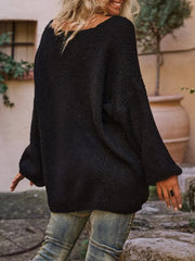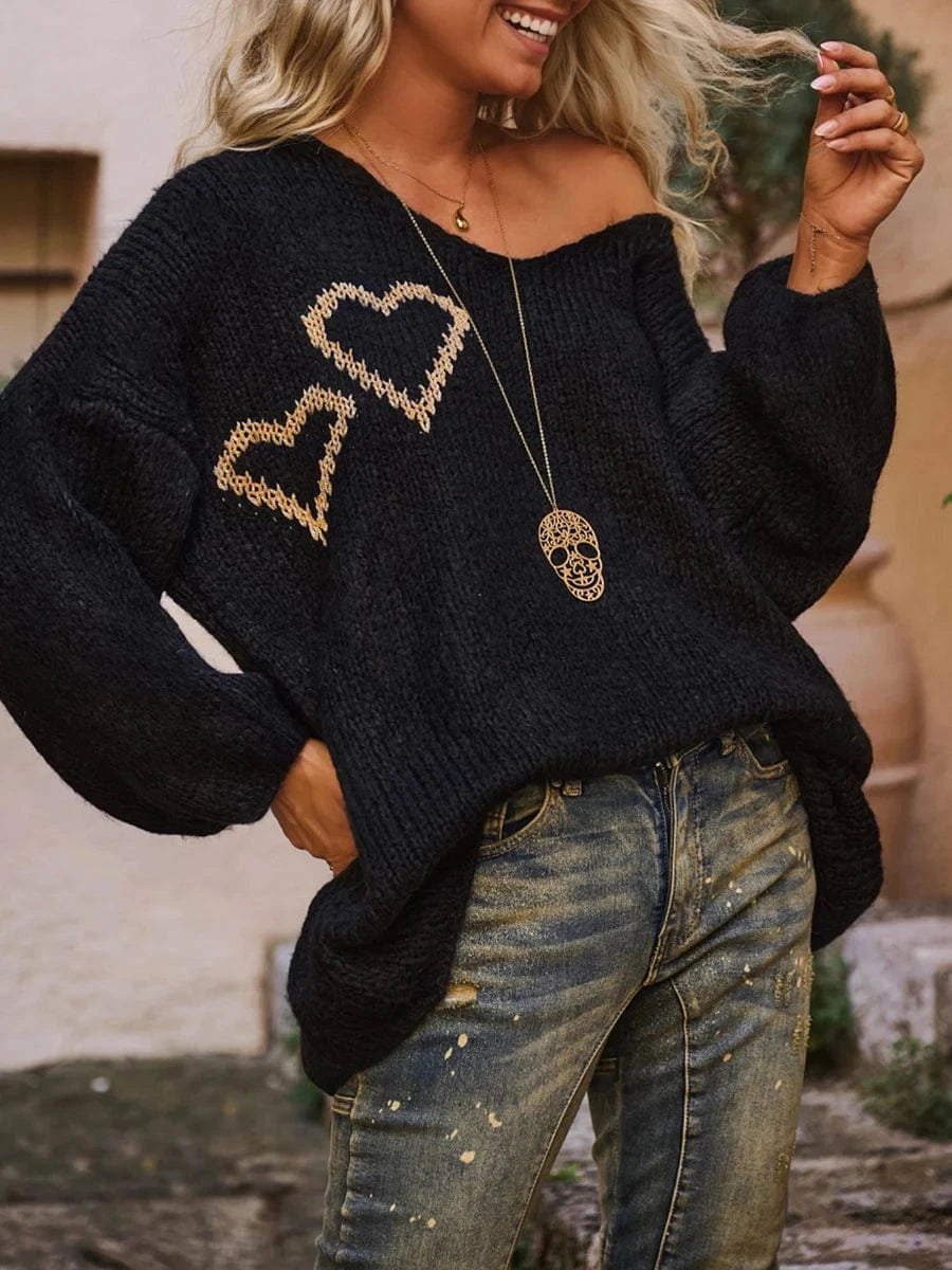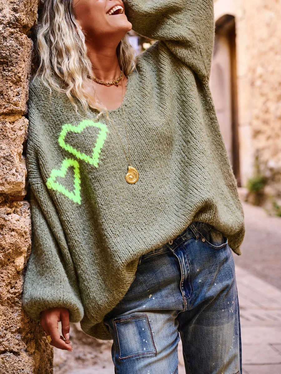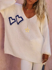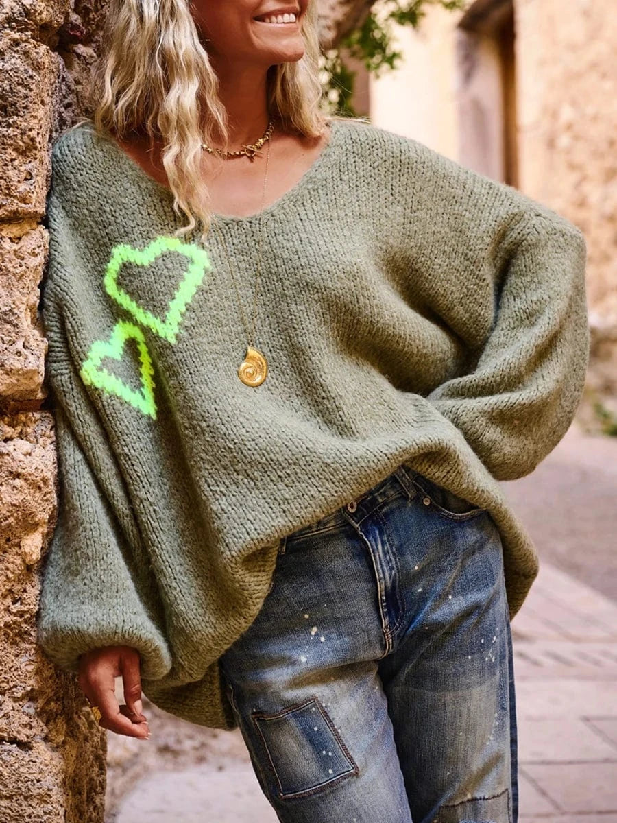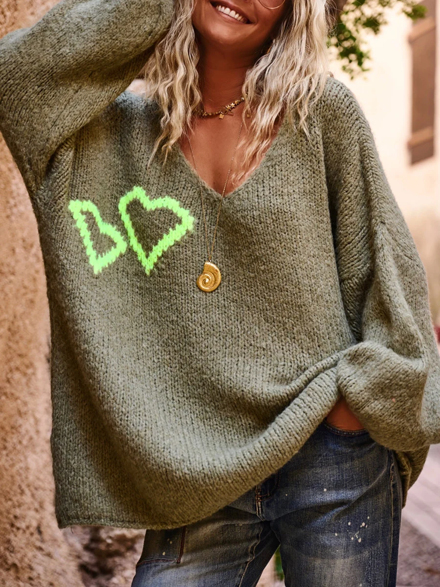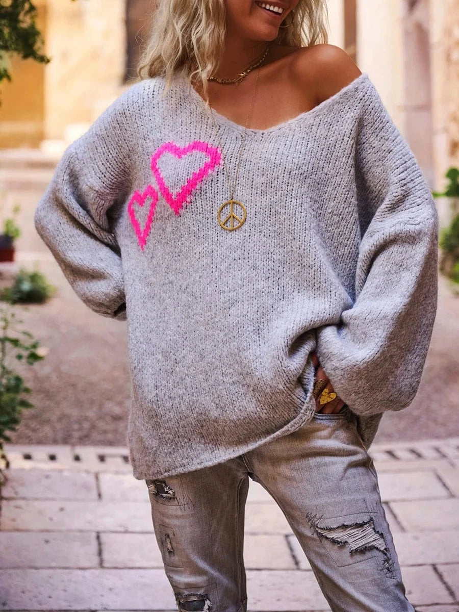 Womens Heart Oversized Sweater V Neck Long Sleeve Drop Shoulder Pullover Knit Tops Casual Streetwear