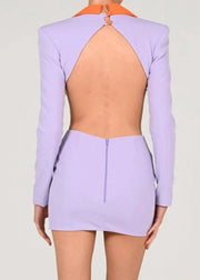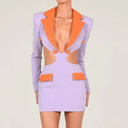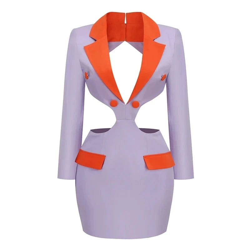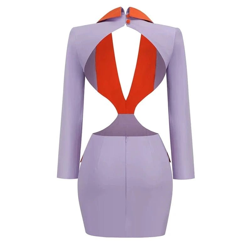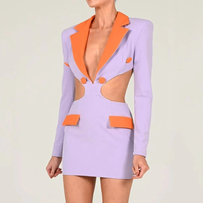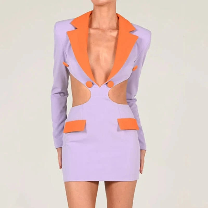 Get ready to turn heads with this fashionable patchwork mini dress! The lapel detail adds a touch of sophisticated style, while the unique design makes a statement. Perfect for any occasion, this dress is sure to make you stand out in the best way possible.