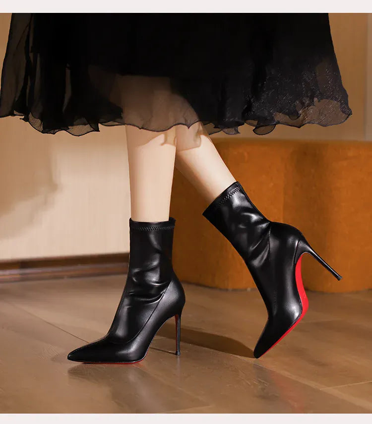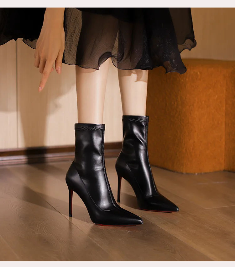 Step into sophistication with these sleek black ankle boots that mean business—and look fabulous doing it. Crafted from premium leather with a pointed toe that elongates your silhouette, the slim fit hugs your leg just right while the elastic panels ensure a comfortable, secure fit all day long. Whether you're heading to the office or out for an evening adventure, these versatile boots transition seamlessly from desk to dinner. The perfect blend of edgy elegance and wearable comfort that'll have you reaching for them again and again.