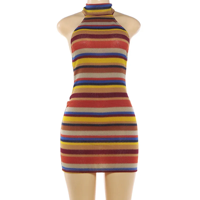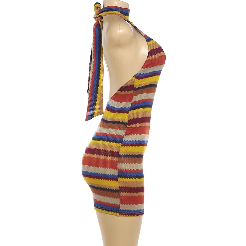 Shop our vibrant striped knit halter mini dress. Featuring a colorful contrast design and sexy backless fit. Perfect for summer vacations and beach parties.