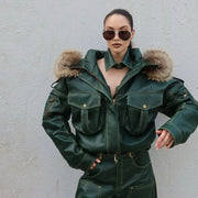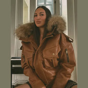 Model Number: Street Detachable Faux Fur Hooded Leather Pants Sets