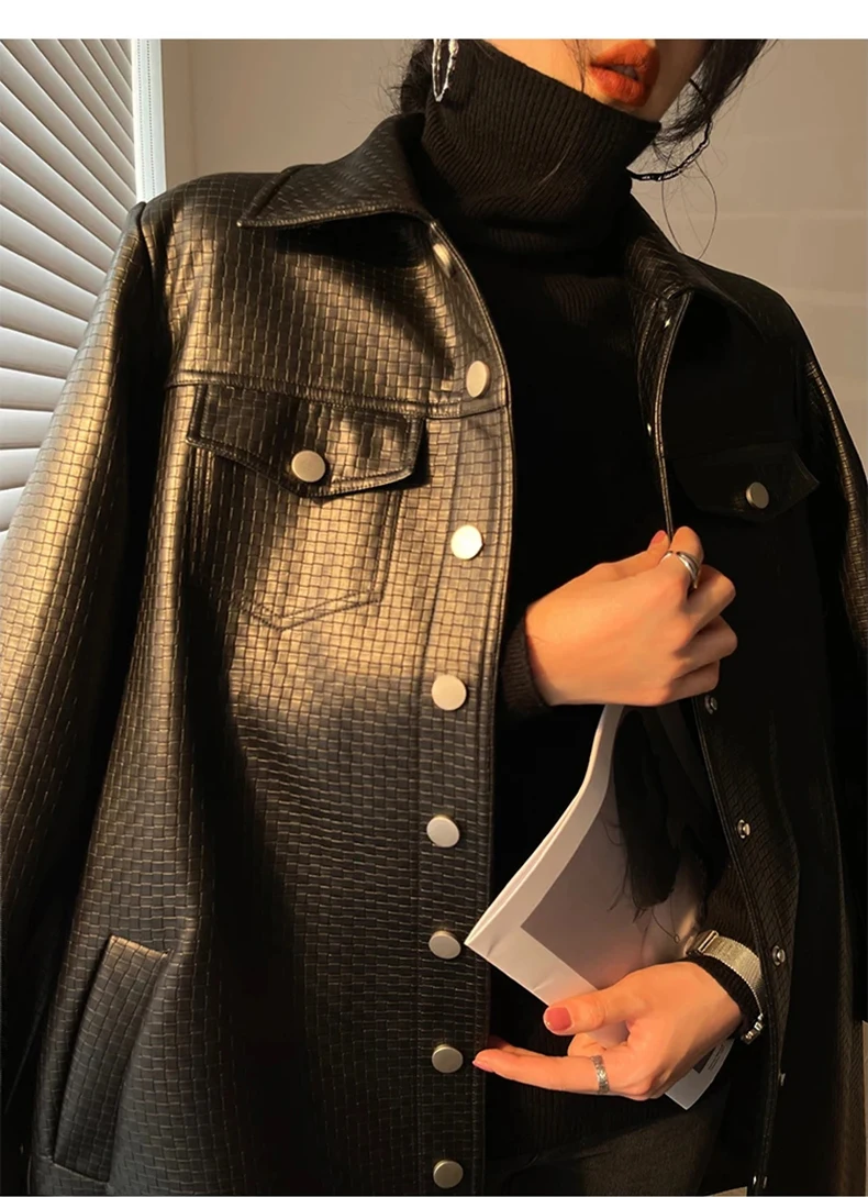 Step out in style with this Women's Black Leather Shirt Jacket that blends edgy cool with carefree charm. Crafted for those who love a little attitude, its sleek leather finish and classic shirt design add a rebellious twist to any outfit. Perfect for layering over your favorite tees or dresses, this jacket turns everyday looks into statement moments. Embrace the playful side of fashion and make your wardrobe pop with this irresistible leather essential.