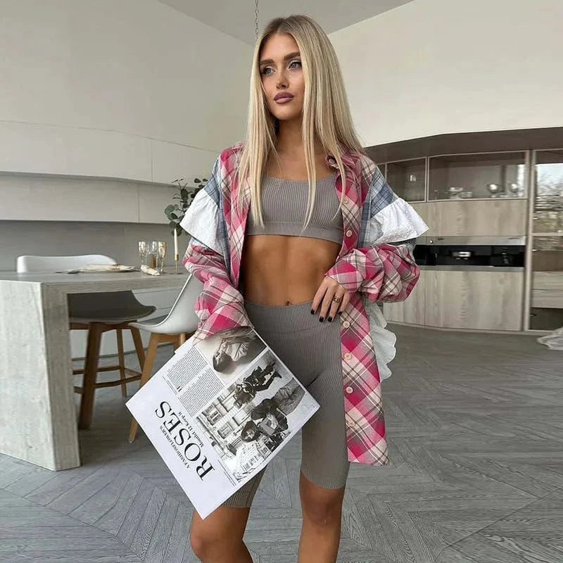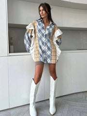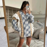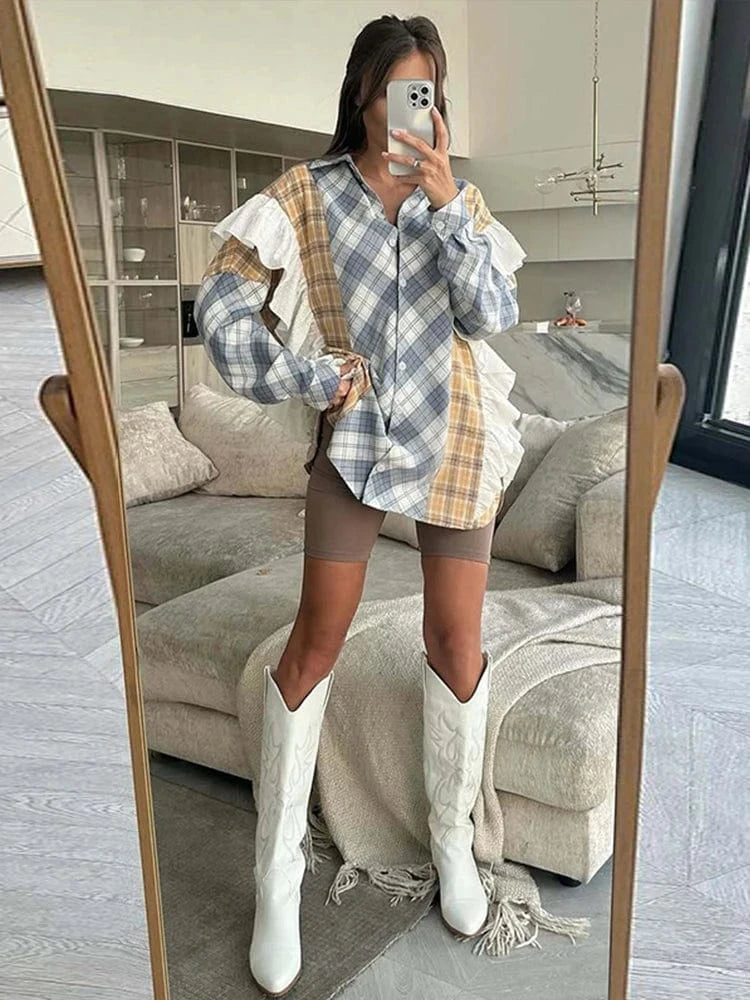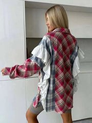 Women's Plaid Patchwork Shirt With Ruffle Details