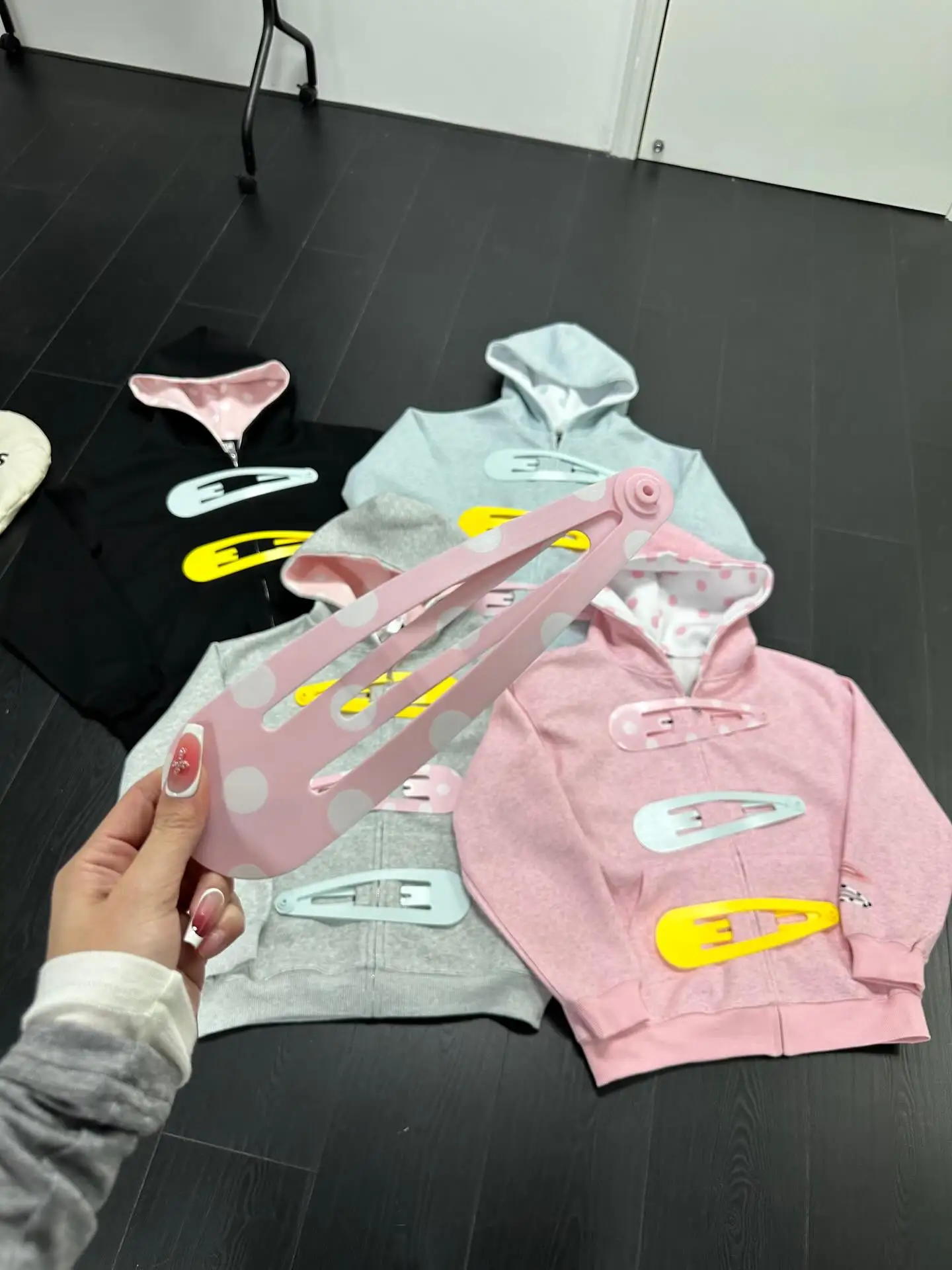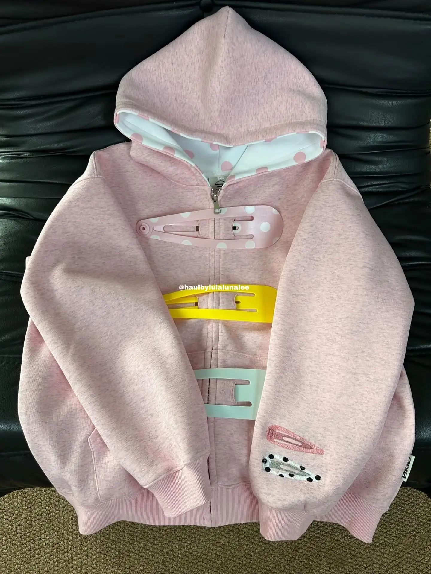Shop our unique American fun sweatshirt with detachable hairpin detail. Features retro polka dot splicing and a punk hooded design. Perfect for alt-fashion lovers.