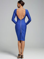 Women's Blue Backless Slit Bandage Long Sleeve Midi Bodycon Dress