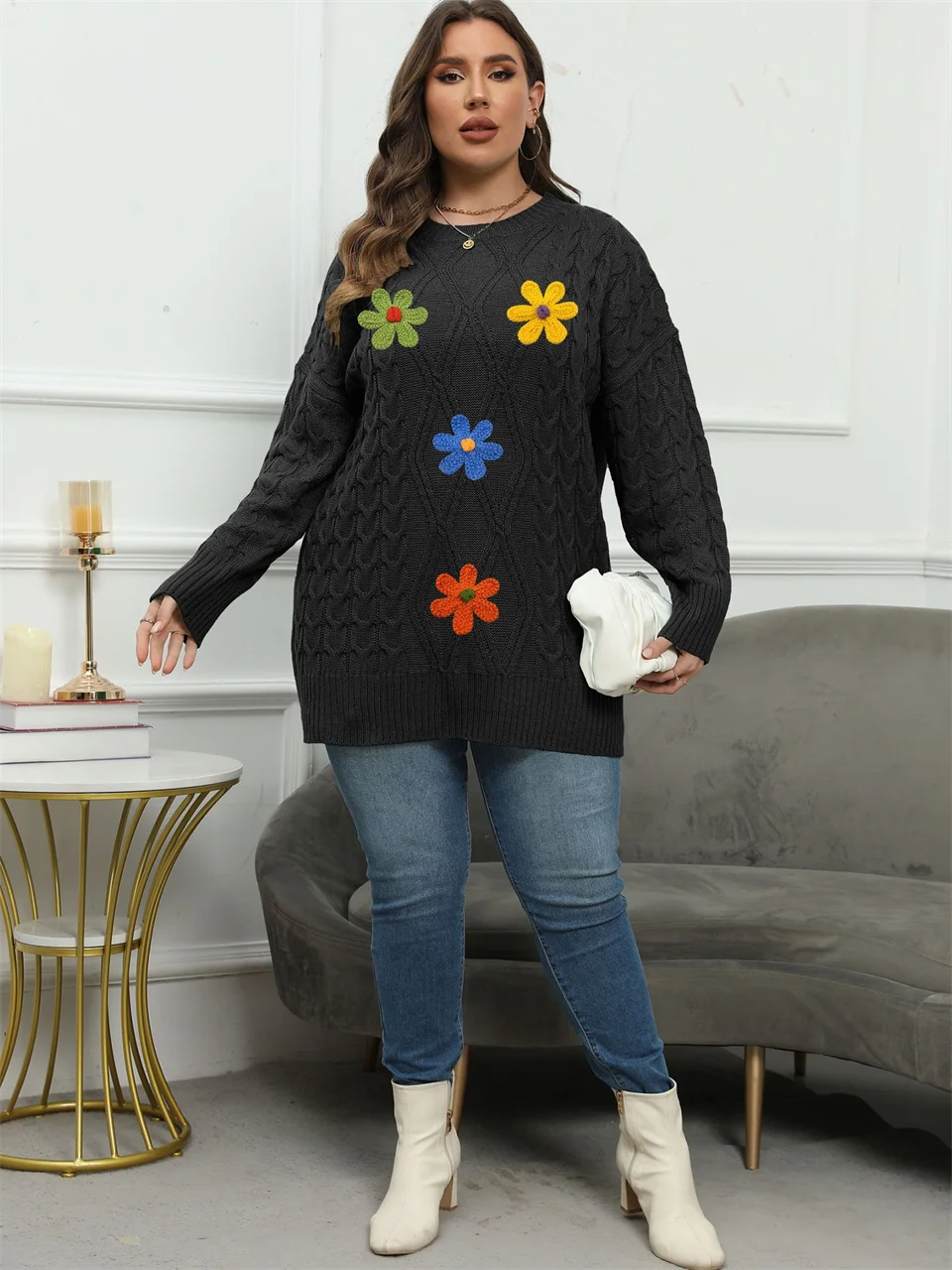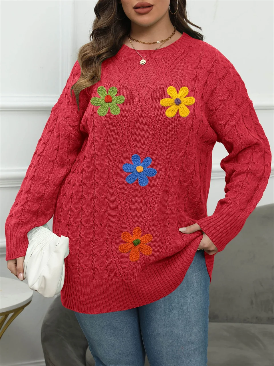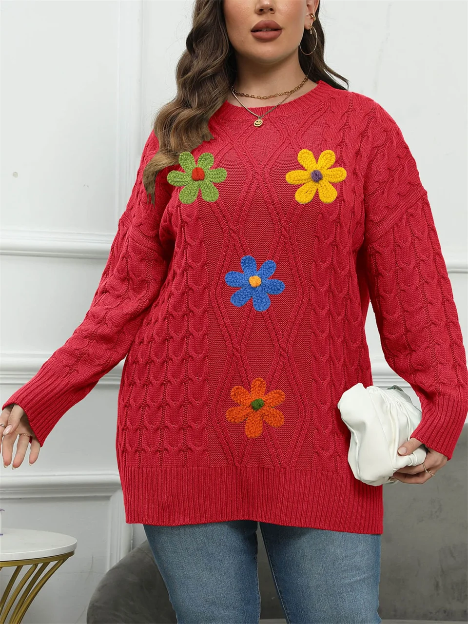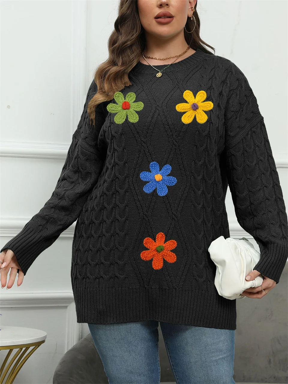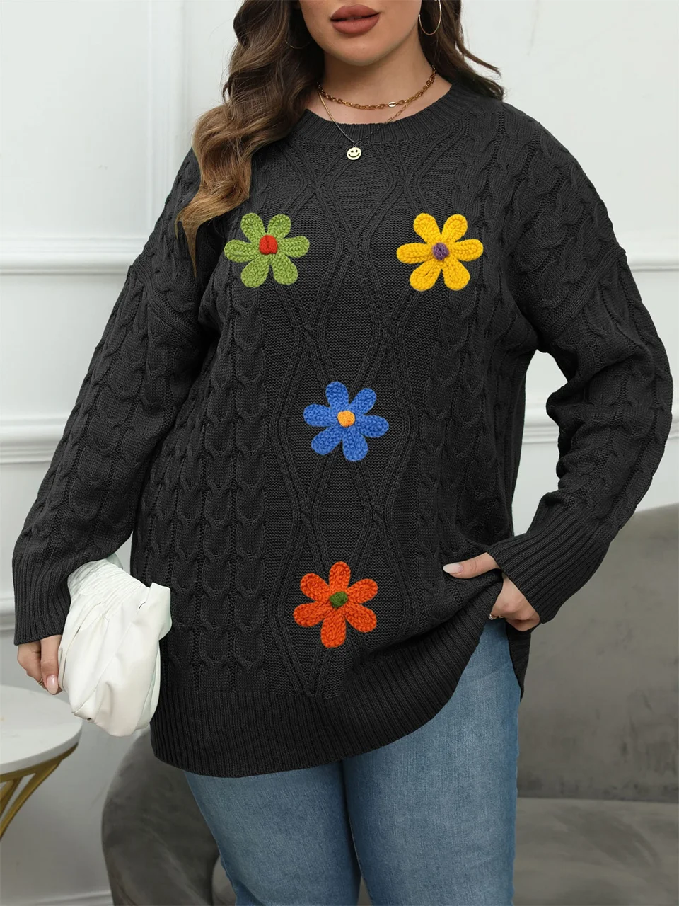 Plus Size Embroidery Flower Crew Neck Sweater