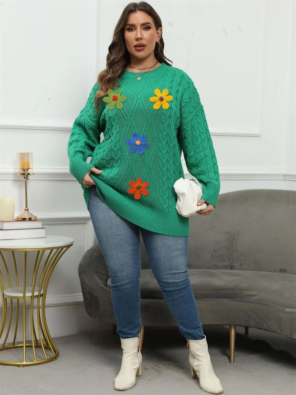 Bloom into comfort with this charming plus-size crew neck sweater, where delicate embroidered flowers dance across soft fabric. Perfect for adding a touch of nature-inspired style to your everyday wardrobe, this piece celebrates curves with a flattering fit and thoughtful design. Whether you're heading out for coffee or cosy nights in, this sweater brings effortless elegance and a cheerful vibe to any outfit. Embrace your unique style with florals that feel fresh and fun.